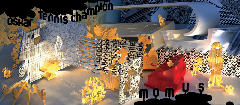 The cover of Oskar Tennis Champion is a photograph of a cardboard sculpture, a creation by Florian Perret, who you may remember also worked on the artwork and installation for Folktronic. The imagery can be interpreted various ways, there are tennis racquets on the left hand side, perhaps the main figure on the right is Oskar himself. The red object might be a piano, the background might show a tower collapsed, flames around it, or it could be a technological item, in the act of exploding. The whole scene is set in glowing light, and the cardboard/paper is marked with lines, almost formally, like technical drawing paper. As Momus says on his LiveJournal website: