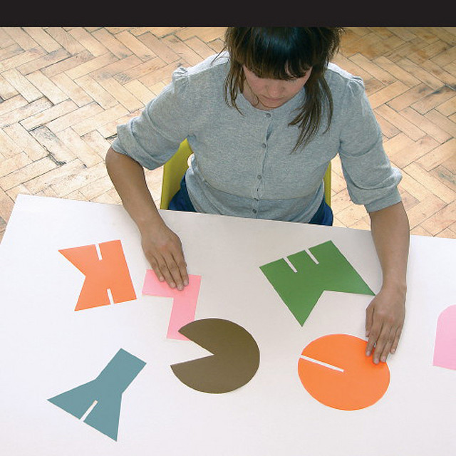 All this fits well with the concept of a friendly album, and points to the playfulness which the sonics and lyrics of the album contain. So the cover as below shows the model Kasja Ståhl (a designer working for studio Åbäke), working with the letters of the title, cut out Munari style in the font Bebit (a popular and free approximation of BabyTeeth). The photo shoot takes some time to organise, and Momus notes the “benign sobriety” and calm of the designers as they complete the work.